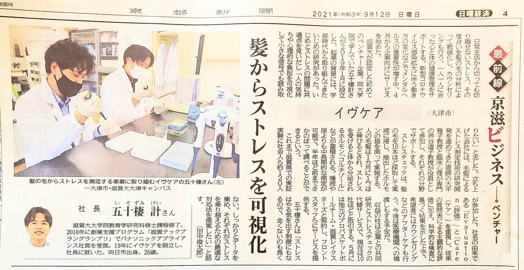 京都新聞に五十棲のインタビュー記事が掲載されました 2021年9月16日 最終更新日時 : 2021年9月16日 evcare 2021年9月12日(日)付けの「京都新聞ー京滋ビジネス欄」に代表 五十棲のインタビュー記事等が掲載されました。 当記事では、「ストレスはやる気を出す刺激にもなり、それぞれがストレスを乗り越えるための最適な対処法を提案したい」と、活動内容や研究を志したきっかけ、また将来の展望について記事にして頂きました。