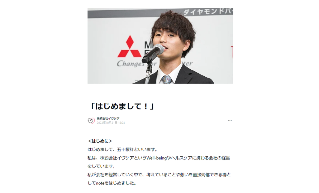 noteはじめました 2022年10月25日 最終更新日時 : 2022年10月25日 evcare 株式会社イヴケアで「note」をスタートしました。第1弾は代表取締役社長の五十棲がイヴケア創業のきっかけ・イヴケアの企業理念の誕生の経緯について投稿しております。 ぜひこちらご覧ください。